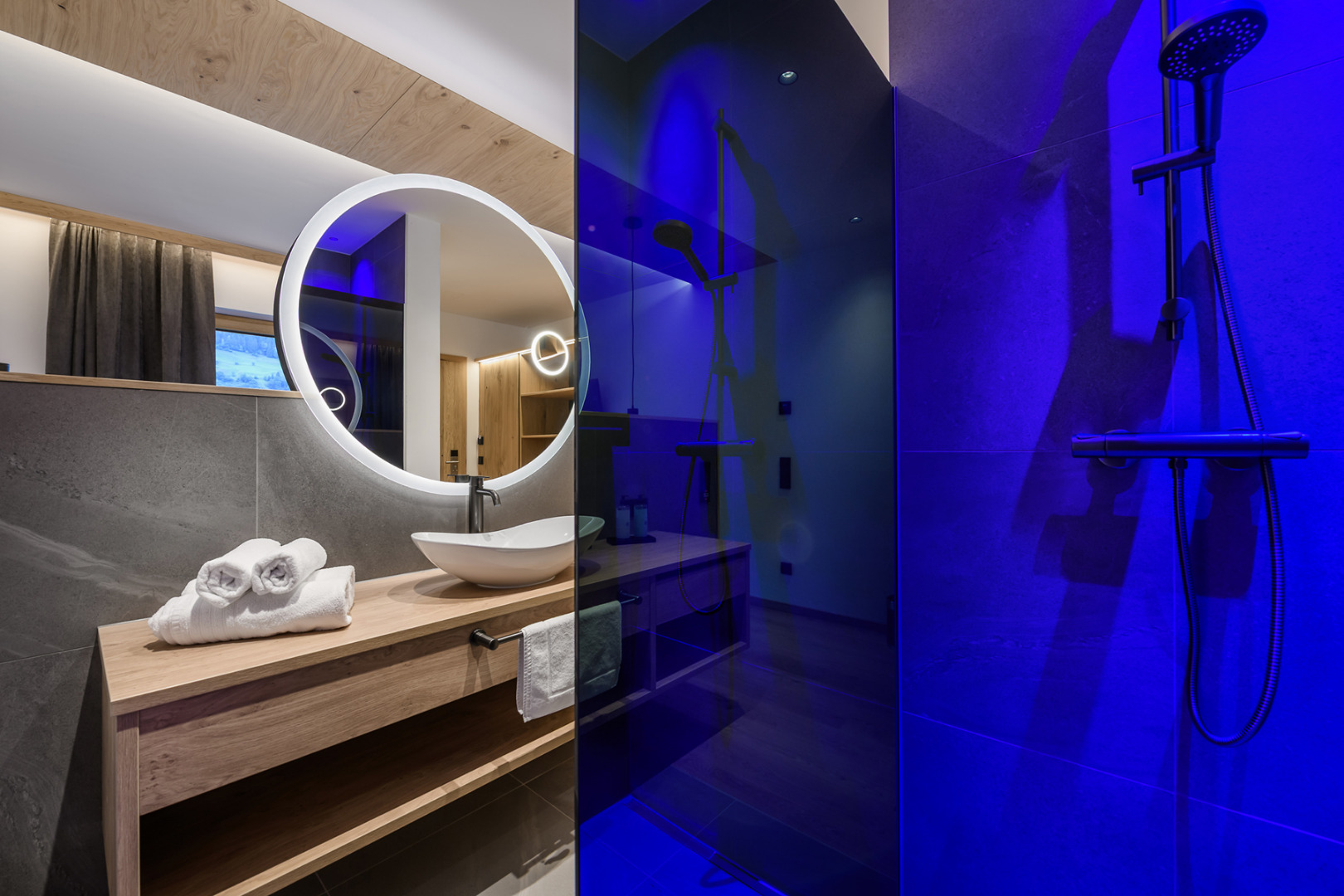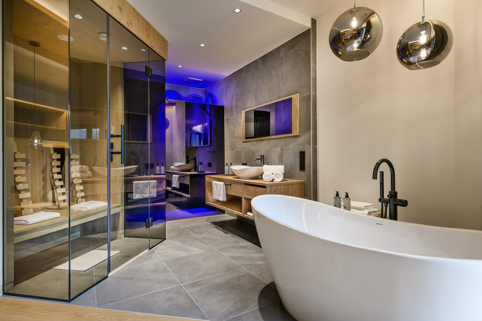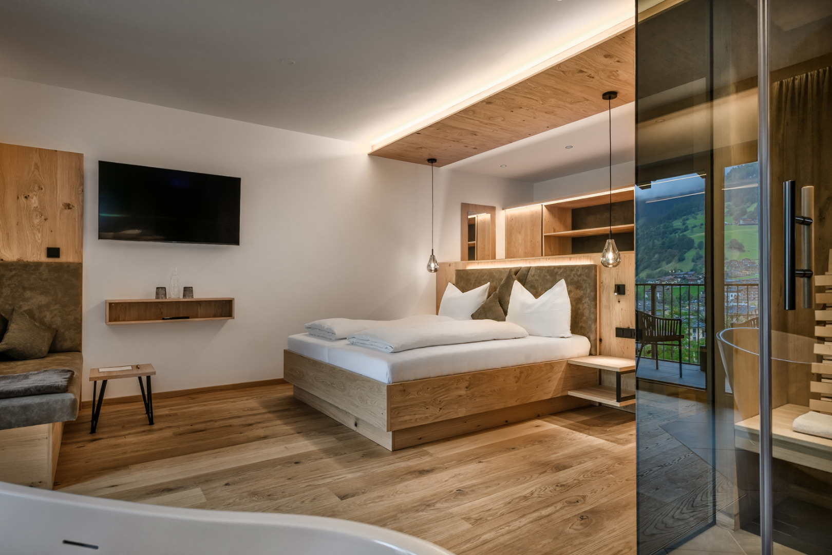 Alpiner Luxus auf 40 m2: Unsere stilvoll eingerichtete Suite bietet eine eigene Infrarotkabine für wohltuende Entspannung, eine freistehende Badewanne mit traumhaftem Blick auf die umliegende Bergwelt und ganz viel Platz zum Abschalten. Perfekt für eine Auszeit zu zweit.
