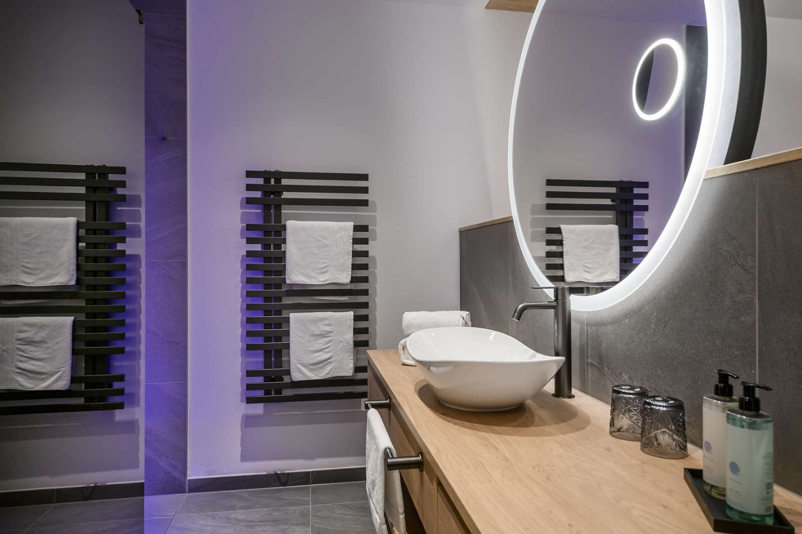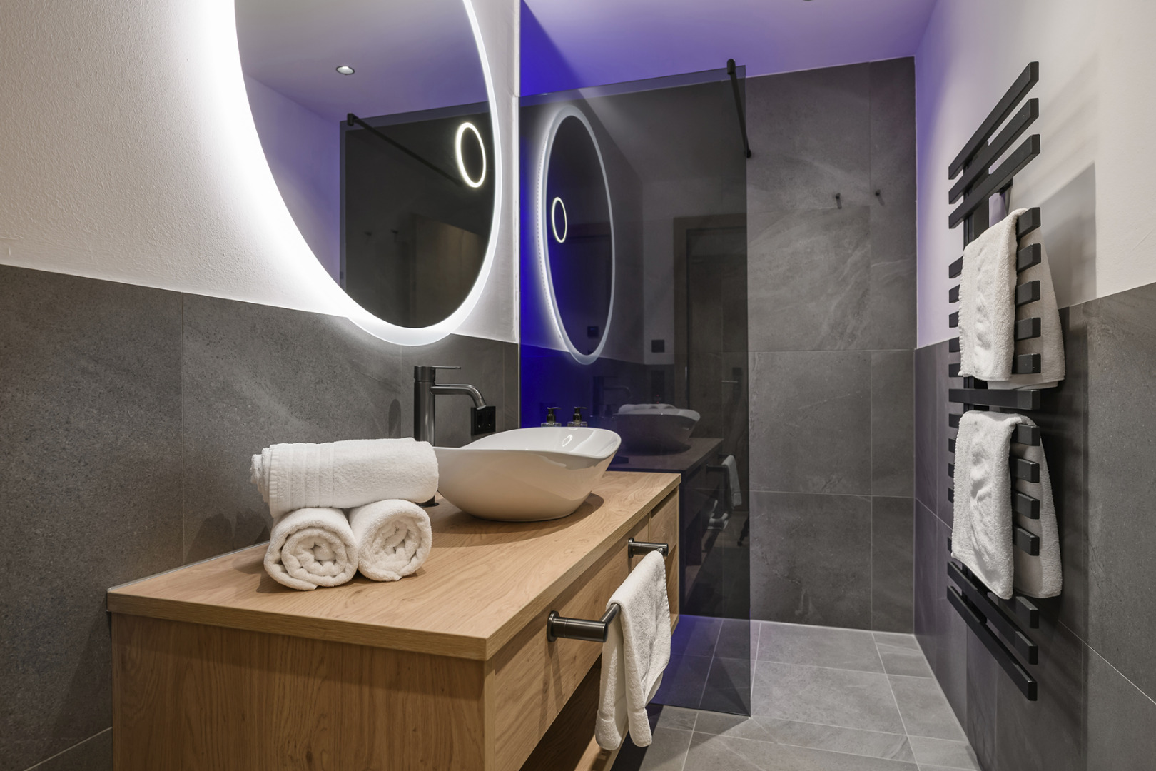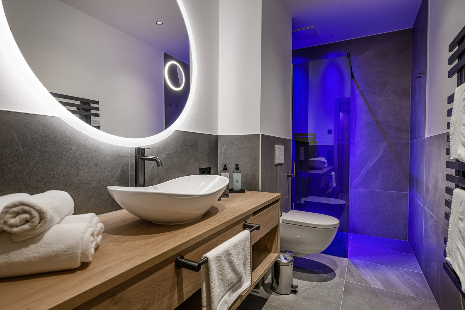 Alpiner Luxus auf 40 m2: Unsere stilvoll eingerichtete Suite bietet eine eigene Infrarotkabine für wohltuende Entspannung, eine freistehende Badewanne mit traumhaftem Blick auf die umliegende Bergwelt und ganz viel Platz zum Abschalten. Perfekt für eine Auszeit zu zweit.
