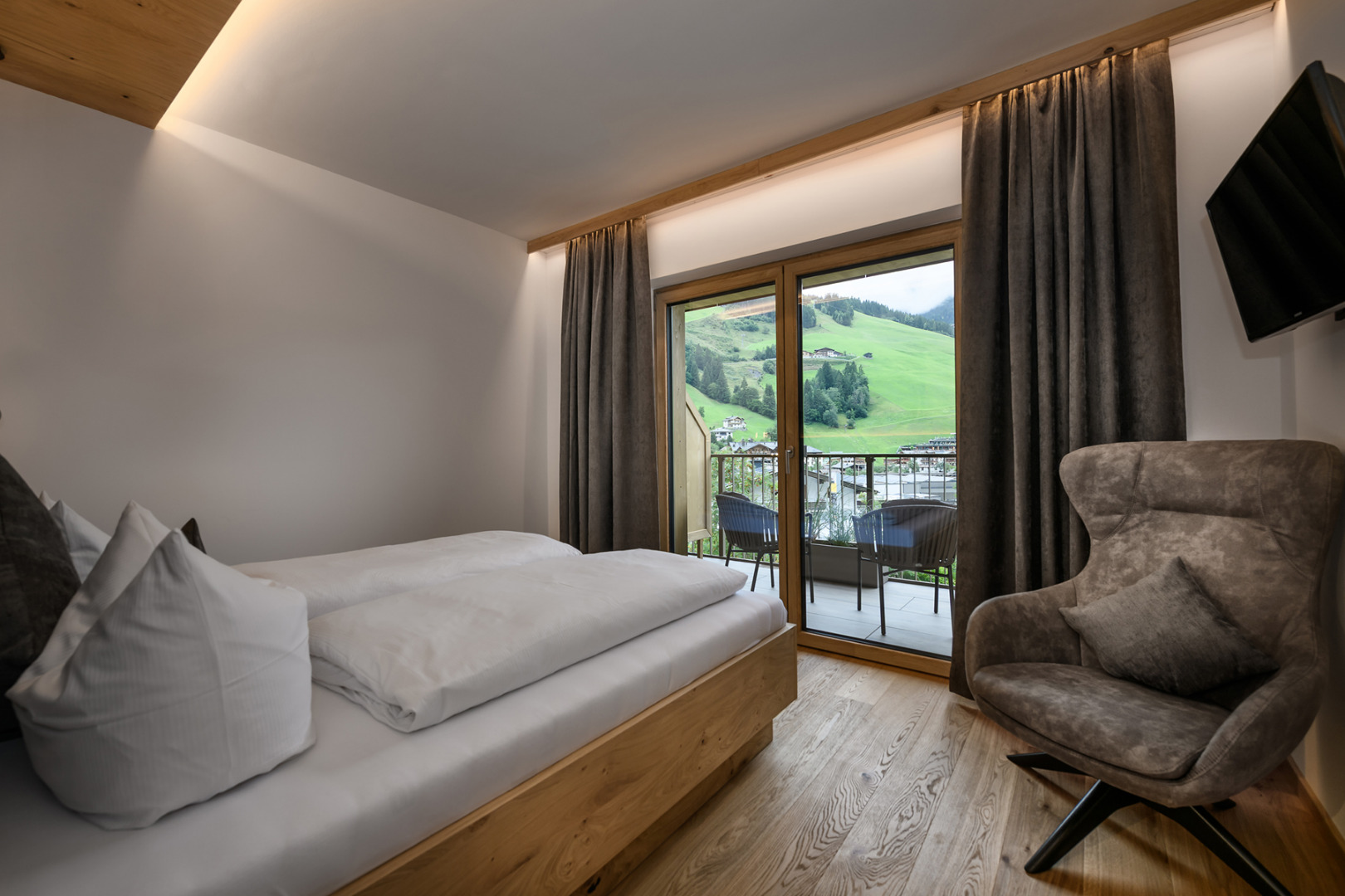 Unser Doppelzimmer Mountain Living für 3-4 Personen vereint alpinen Charme und modernen Komfort. Der traumhafte Blick auf die umliegende Bergwelt rundet das Wohnerlebnis ab.