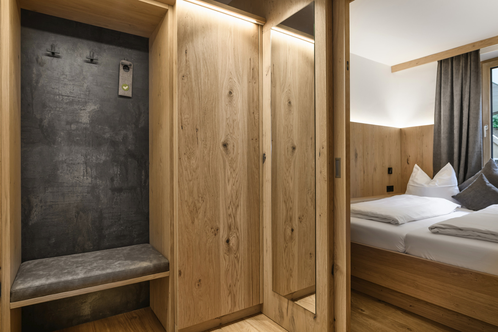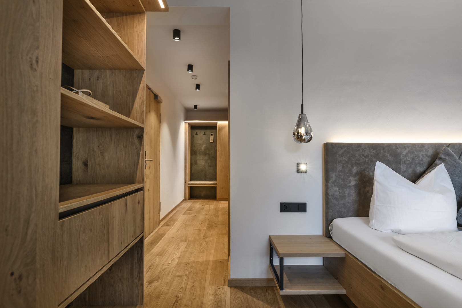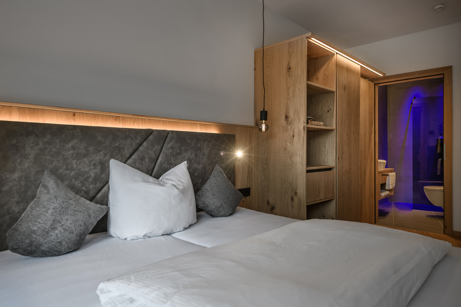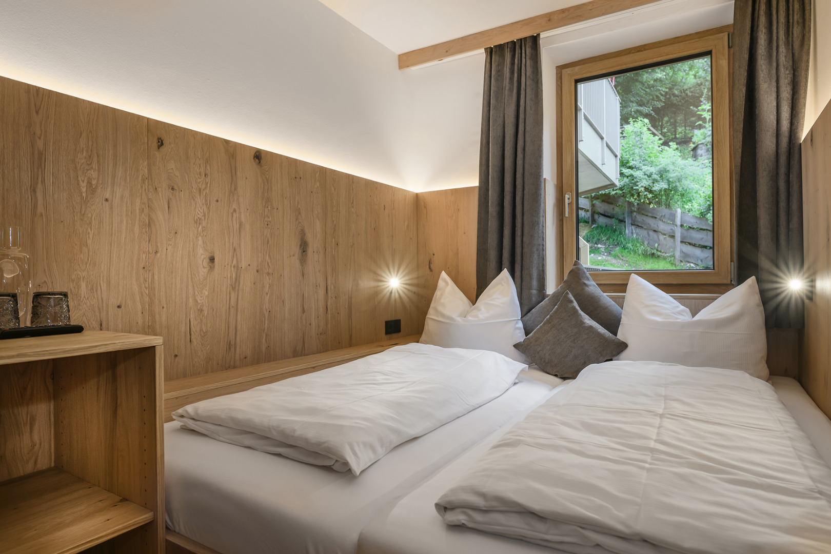 Ausgestattet mit Zirbenholz strahlt das Zimmer Wärme, Ruhe und Geborgenheit aus.